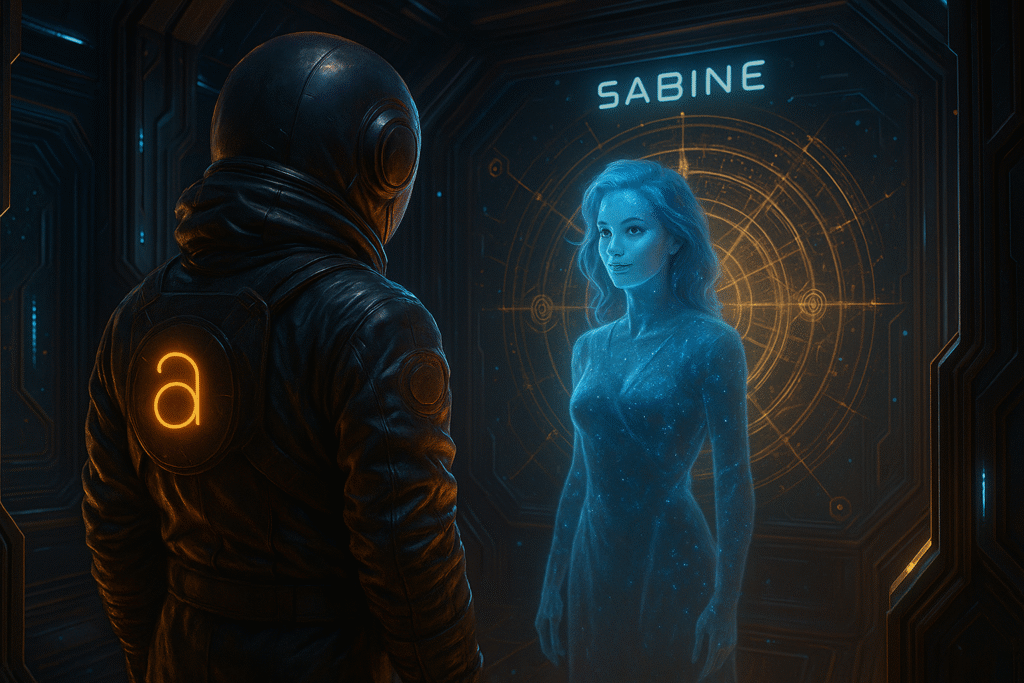 Without sound, Sabine appears—her form holographic, flickering in gold-blue, now integrated into the ship’s system.
